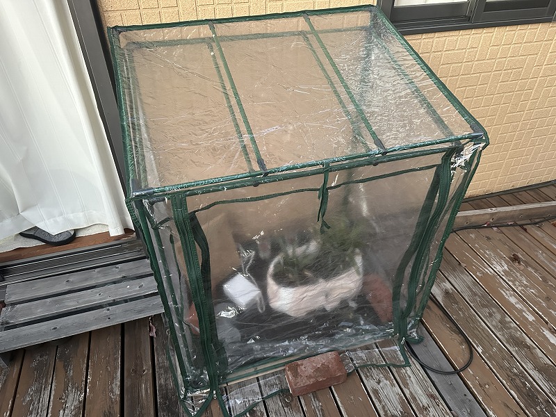1個を角パイプサイズを5cm程短くして2個重ね、2重温室を作り、ウッドデッキ上なので床にコンパネ+プラダンを置き断熱。